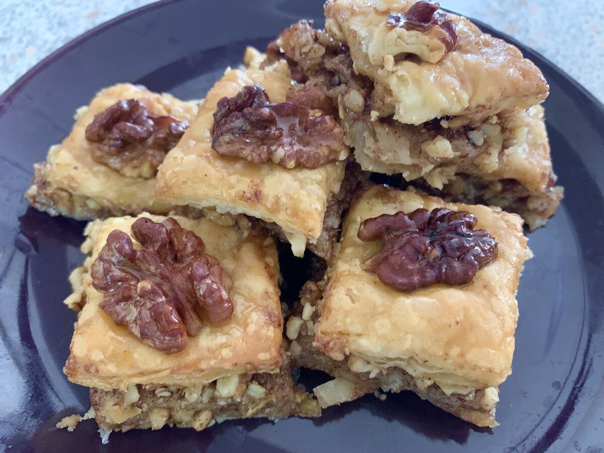 Есть отличный вариант, быстрый и нетрудный в приготовлении. Справится каждый. Это вариация на тему восточных сладостей ПАХЛАВА с орехами из слоеного теста. Для ее приготовления нам понадобятся следующие ингредиенты: Тесто слоеное бездрожжевое - 500 гр; Сахар - 250 гр; Корица - 2 ст. л; Масло сливочное (растопленное) - 150гр; Мед (жидкий) -50 гр; Орех грецкий - 250 гр.
