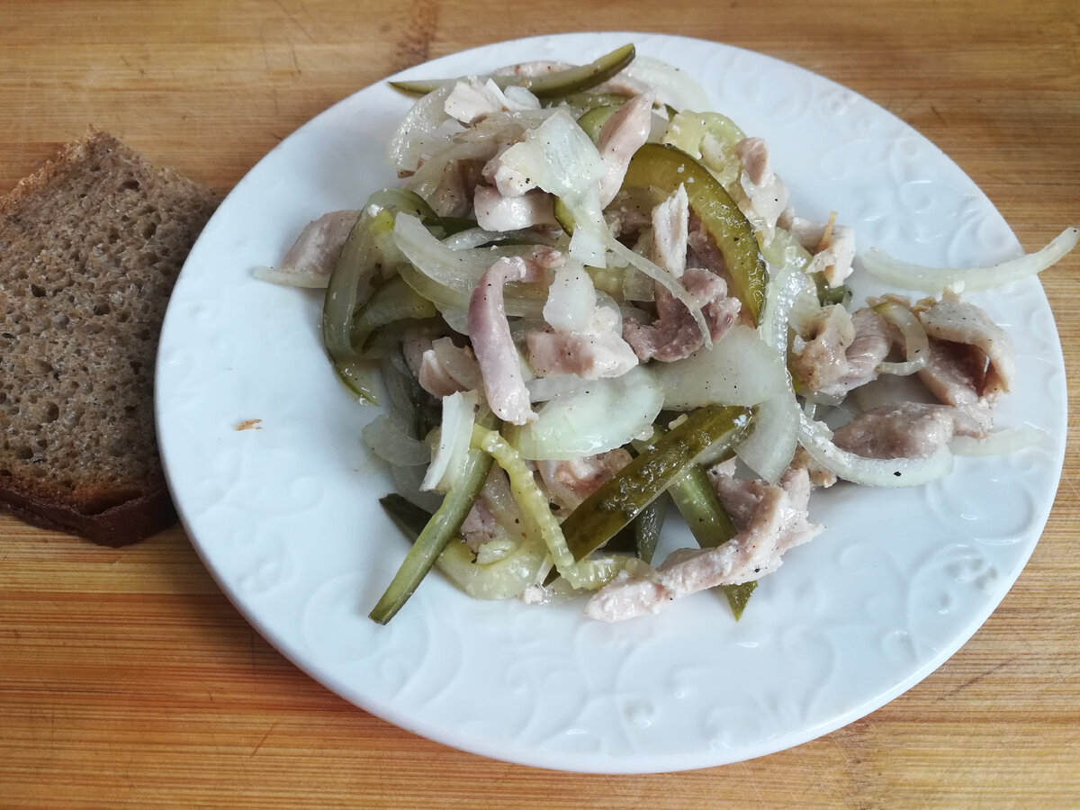 Такой салат я частенько делаю вместо основных блюд. Это во-первых «пп питание», очень сытный и одновременно легкий. Так как мы сами выращиваем мясо бройлера, использую курицу. Это и быстро в приготовление. Можно использовать любое мясо, которое есть в холодильнике. Куриную грудку нарезаю на соломку. Готовлю в микроволной печи, не солю. Маринованные огурчики нарезаю соломкой. Одну среднюю головку репчатого лука нарезаю перьями. Всё это я делаю, пока готовиться курочка. Очищаю три-четыре зубчика чеснока. На сковороду наливаю растительное масло пятьдесят миллилитров, разогреваю. В масло для обжарки кладу один лист лаврового листа, чайную ложку черного молотого перца, на кончике ножа острого красного перца, чеснок – всё это обжариваю до румяного цвета чеснока. Обжаренный чеснок придаст пикантный вкус салату. Приступаю к сборке салата. В глубокую вазу выкладываю готовую курицу, репчатый лук, маринованные огурцы. Заливаю растительным маслом с обжаренными специями, убираю лавровый лист. Можно