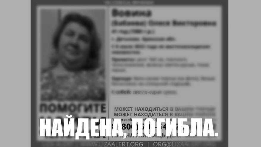 Ранее «Брянская Губерния» рассказывала, что без вести пропала 41-летняя Олеся Вовина. О ней ничего не было известно с 8 июля. Стало известно, что женщину нашли мертвой. Об этом сообщили волонтеры поисково-спасательного отряда «Лиза Алерт». При каких обстоятельствах погибла Олеся, не уточняется. Родным и близким выражают соболезнования. ФОТО: vk.com/la_bryansk
