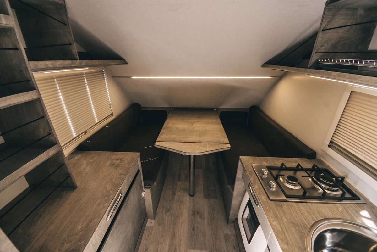 Всегда в базовой комплектации Adria Aviva будет газовая плита с двумя горелками, мойка и абсорбционный холодильник который отлично работает от газа, 220V и чуть похуже от 12V. Но это беспроигрышный вариант который в прицепе российского производства даст удорожание более чем на 70 000 руб.