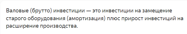 Средства инвестиции каждый может либо потратить, либо оставить сбережение, которые могут быть запущены в оборот. Система может быть настроена автоматически, поскольку свободные средства могут быть перечислены на счет в банке для дальнейшего процесса. Классифицировать инвестиции можно следующим образом: реальные инвестиции, спекулятивные инвестиции, финансовые инвестиции. Также инвестиции делятся по целям, срокам, по форме собственности, видам. Интересующий нас вид: брутто-инветсиции. Относительно объекта они могут разделяться на материальные, нематериальные, фи