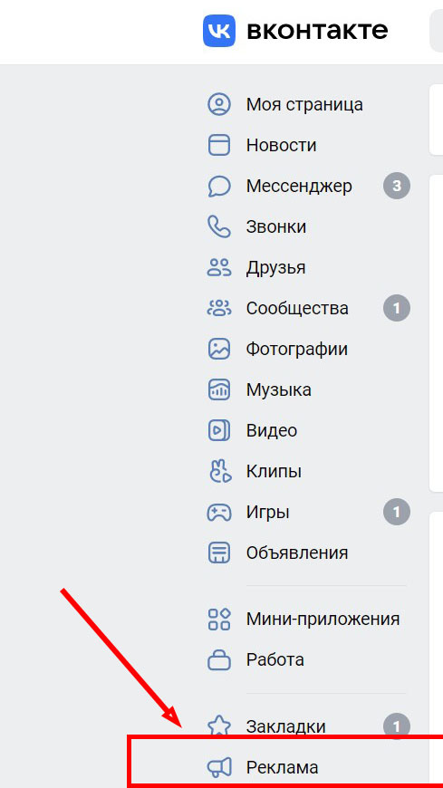 Сначала откройте раздел «Реклама» (он находится в столбике слева на основной странице вашего профиля).