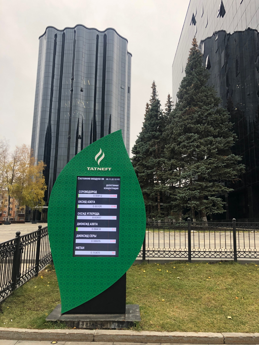 У головного здания ПАО Татнефти установлен экран, где в режиме реального времени показывается уровень вредных веществ в воздухе.