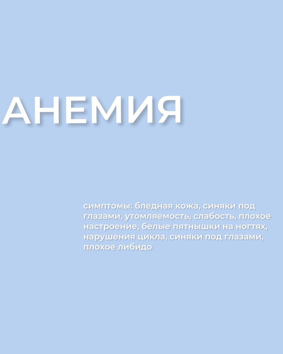 Анемия Пролистывать пост нельзя, супер актуальный пост, посвящается всем уставшим, депрессивным, бледным с синяками под глазами 👌 Я и сама сталкивалась с анемией несколько лет назад в виде волосопада (писала под тегами) ❗️Анемия - состояние дефицита железа Как понять, что у вас возможно есть дефицит? 😞Плохое настроение 😞Встала уже устала 😞Бледная кожа 😞Синяки под глазами 😞Выпадение волос, плохое качество волос 😞Ногти с белыми пятнышками, неровной поверхностью 😞Тяга на сладкое или кофе, мало белка в рационе, редко едите печень и мясо 😞Укачивание в транспорте 😞Сильная чувствительность к запахам 😞Нарушение менструального цикла,болезненные, обильные месячные, их отсутствие. 😞Шум в голове 😞Рассеянность, забывчивость 😞Холодные конечности, мерзлявость 😞Отклонения в росте и развитии у детей 😞Частые простуды 😞Сухие пятки, кожа ⚠️Для чего нам железо? Железо необходимо для выработки гемоглобина, гемоглобин - это переносчик кислорода от легких к клеткам. 🔥Что делает орган