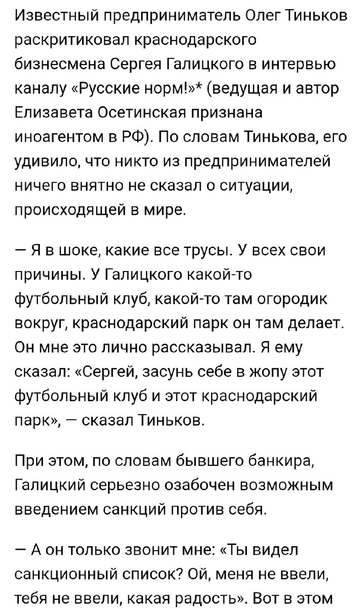Давайте рассмотрим эту ситуацию. Первое, для бизнесменов уровня Сергея Николаевича Галицкого и Олега Тинькова - границ не существует. Они мыслят рамками выгодно или невыгодно здесь строить бизнес. Насколько безопасно, рискованно, в данной стране. Абсолютно циничный, прагматичный подход. Смотрите слова Тинькова и комментарии под роликом Андрея Ковалёва. Листайте вправо: Иметь несколько пас