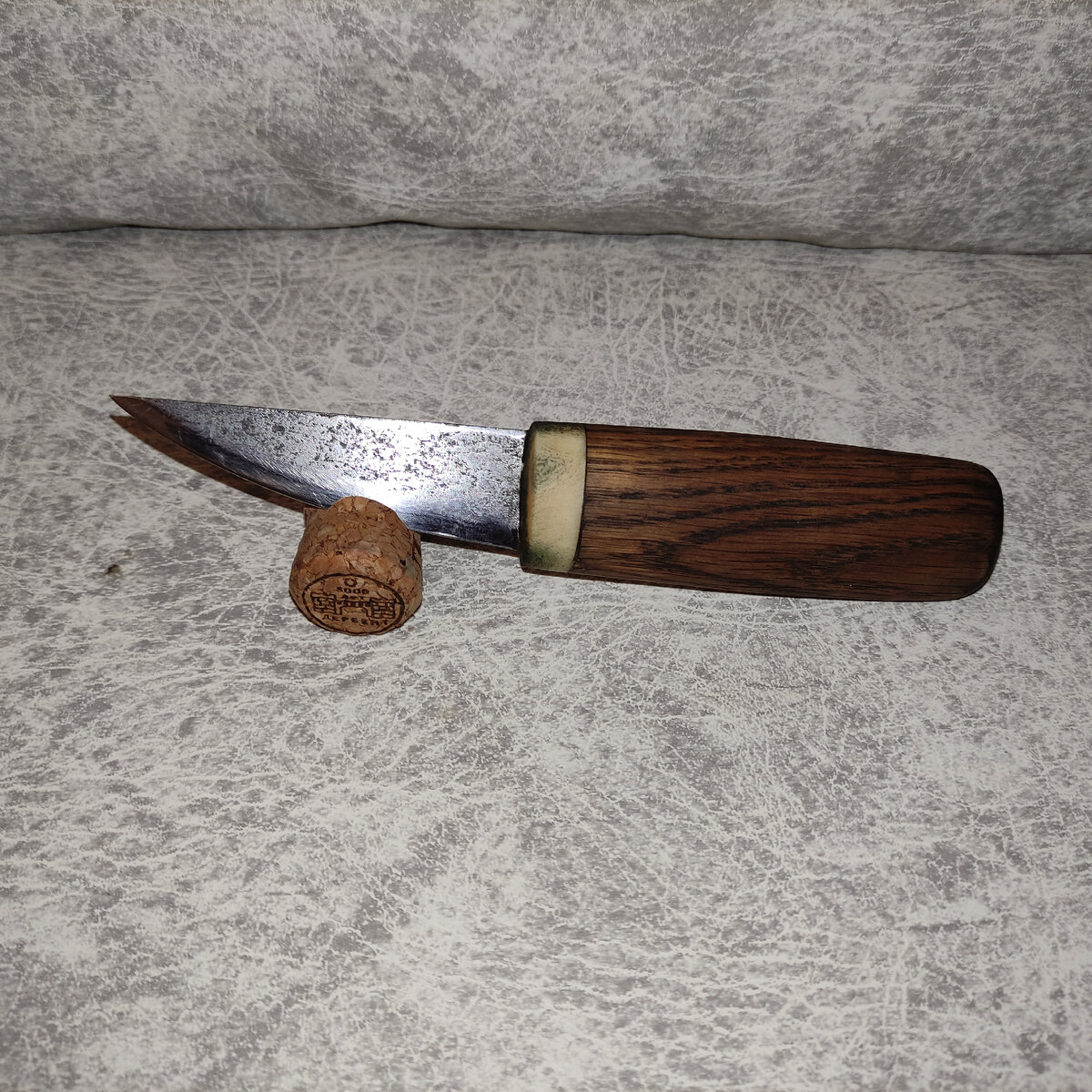 Было это лет пять назад, задумался я над ножом который был бы мне помощником и спутником. Важно что бы он удобно сидел в руке, держал заточку и его было бы не жалко.... Мои любимые ножи напальчники не могли справиться с частью задач в виду небольшого размера, классические охотники рыболовы слишком велики. Значит надо искать что то среднее между ними! Все это вылилось в данный вариант. Рукоять из дуба, пропитана воском на горячую( не скажу что это предел мечтаний но пять лет эксплуатации через день минимум , не плохой вариант) . Клинок изготовлен из моего любимого быстрореза, а именно Р6М5. По форме немного напоминает финки. Больстер рог лося , достаточно старый и сухой а поэтому тоже смог принять в себя некую толику воска. Что я им делаю? Я обстругиваю деревяшки, готовлю еду, разделываю мясо( ну как мясо ... разделать тушу барана, отделить жир, нарезать мясо для мясорубки, нарезать мясо для тушения ) порой использую в ремонте . В поездках на природу он со мной, если нужно вскрыть к