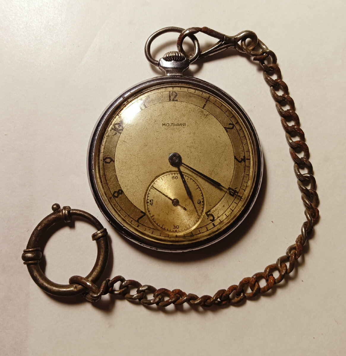 Доброго времени суток! Вот такие часы раритетные попали в ремонт. Состояние соответствует году выпуска. Часы на ходу, но нуждаются в чистке и смазке. 2-й квартал 1953 года - это значит что им уже без малого почти 70 лет. Снял ободок со стеклом, состояние циферблата конечно оставляет желать лучшего. Механизм удерживается в корпусе двумя винтами. Также вал заводной нужно снять немного отпустив винт фиксатора. Снял стрелки, циферблат и коронное колесо. Баланс и вилка целенькие - это радует. снимаю колёса и барабан. Разбираю ремонтуар и тут первый сюрприз - сломан винт моста, залом остался в платине. Разобрал ремонтуар полностью. Сломанный винт немного торчит с обратной стороны платины - попробую его выкрутить. Мне повезло - выкрутил залом с помощью пинцета. Все детали отмыл в бензине и приступаю к сборке. Собираю в обратном порядке - вначале механизм перевода и завода. С донора снял нужный мне винт взамен сломанного. Установил центральное колесо. Установил промежуточное, секундное и анк