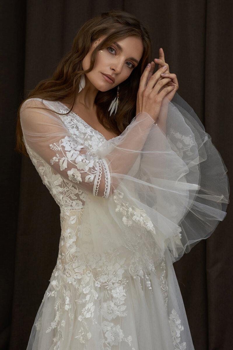 Прокат 7500₽ , срок 1-3 дня. Пошив 34500₽, срок 5 недель. Платье А-силуэта. Многослойная юбка из фатина декорирована кружевом и имеет большой разрез сбоку, сзади небольшой шлейф. Рукав выполнен из фатина с аппликацией кружевом, расклешенный от локтя. Лиф имеет глубокий вырез и вставные чашки (бюстгальтер не требуется). На спине застежка на молнию, декорирована мелкими пуговицами. Размер: 46 Материал: Мягкий фатин, кружево, смесовая подкладка Ателье и прокат свадебных платьев в Москве www.bohoweddress.ru #прокатсвадебныхплатьев #пошивсвадебныхплатьев #свадебныеплатьянапрокат #свадебноеплатьебохо #бохосвадьба