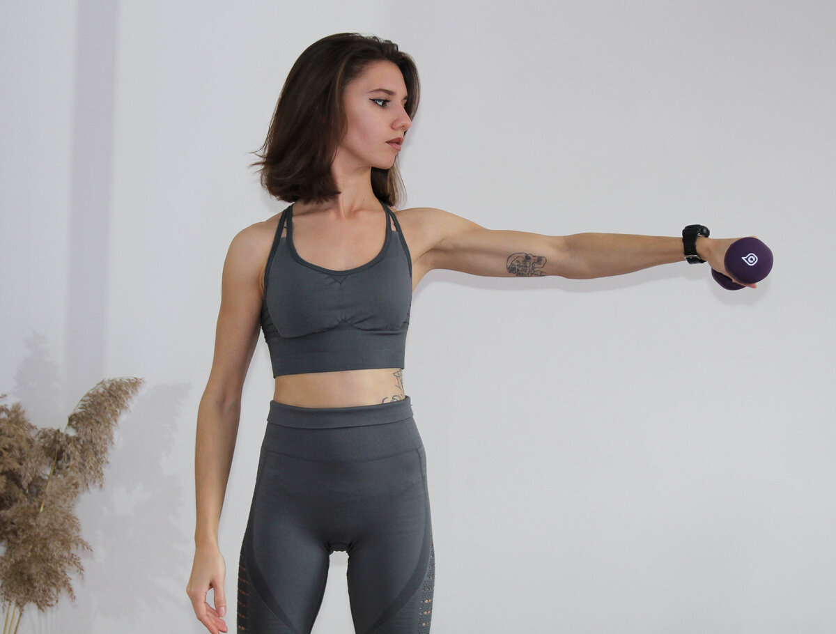 Упражнение, максимально задействующее средние дельты. Оно даёт красивый рельеф плеча, ну и конечно же развивает силу плечевого пояса в общем. Для его выполнения понадобятся гантели. В конце расскажу вариант с эспандером. Не берите большой вес, начните с малого, у нас тут не бодибилдинг, мы прорабатываем мышцы и заморачиваемся над техникой. Итак, техника выполнения: встаньте перед зеркалом, гантели в руках. Корпус напряжен, подтянут. В пояснице не должно быть прогиба. Руки опущены, локти напряжены. Это исходное положение. Отсюда, на выдохе, одновременно отведите в стороны обе руки. Выше плеча не поднимайте! Зафиксируйтесь в этом положении, и на вдохе опустите руки, вернувшись в исходное положение. Заметьте, что всё движение происходит только в плечевом суставе, локти и запястья неподвижны. Теперь о работе с эспандером. Это может быть трубчатый эспандер (как у меня), толстый длинный или эластичная лента. Вам нужно зафиксировать один конец где-то снизу. По технике выполнения то же самое.