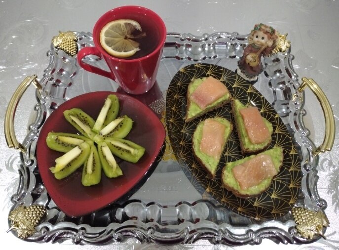 2 тоста из хлеба энергия здоровья (41г), натёртые чесночком (2г), с авокадо (60г) и с/с форелью (50г), киви (130г) и сладкий чай (300мл) с лимоном