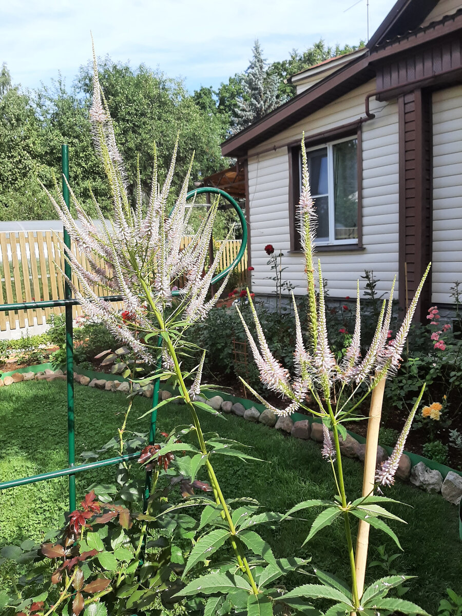 Всё ещё достаточно редкое растение в наших садах, но незаменимое для создания вертикали, мощное, крепкое и с красивыми "канделябрами". Уж если мне что-то нравится, то я покупаю сразу много, всех цветов и рассаживаю, где только место найду. Первый свой вероникаструм я подселила в компанию к плетистым розам - Rosarium Uetersen и ещё одной, которая пересорт и напоминает Parade, но это не точно. Вероникаструм виргинский – элегантный, высокий, стройный многолетник, который может достигать высоты 1,5 метра. Он очень популярен из-за красоты листьев, расположенных правильными ярусами, и благодаря соцветиям в виде колосков, которые могут быть розовыми, сиреневыми (V.virginicum ‘Fascination’), голубыми или белыми. Вероникаструм довольно быстро образует красивый прямостоячий куст с очень прочными прямыми побегами, высота которых колеблется от 1 м до 1,8 м, при ширине 60-70 см, в зависимости от сорта. Растению требуется 2-3 года, чтобы хорошо укорениться, со временем оно становится очень вынос