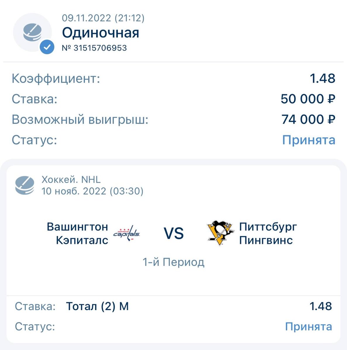 сегодня мы рассмотрим Вашингтон Кэпиталс и Питтсбург Пингвинз. В большинстве встреч данных команд - первый период максимально скучный, больше добавить нечего. Просто катаются и изучают друг друга. Ждëм победу по ставке и максимально пассивный первый период. А другие выигрышные ставки ты найдешь в моём телеграмм канале, ссылка в шапке профиля 🤫