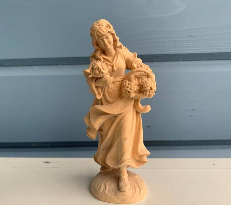 В сказочном месте мы купили эту воздушную невесомую фигурку девочки с корзиной цветов. И это место - баварская деревня Обераммергау, где издавна живут знаменитые на всю Европу резчики по дереву. Деревня расположена в Верхней Баварии в долине реки Аммер среди Альп на высоте около девятисот метров, недалеко от монастыря Этталь. Место это славится резчиками по дереву, традиционное искусство которых уходит своими корнями в средневековье. Художественная резьба по дереву в Обераммергау начала развиваться для украшения монастыря и окрестных приходов еще в XIV веке. Резчики по дереву из Обераммергау стали известны изображениями Марии, Христа, распятий, а также рождественских фигурок и вертепов. По этой причине мастеров из Обераммергау называли «Резчиками Господа Бога» (Holzschnitzerei). Позже стали делать игрушки. Вырезанные из сосны и раскрашенные яркими красками деревянные игрушки из Обераммергау: куклы, марионетки, деревянные солдатики, разъезжались отсюда по всей Европе. Продажу резных изд