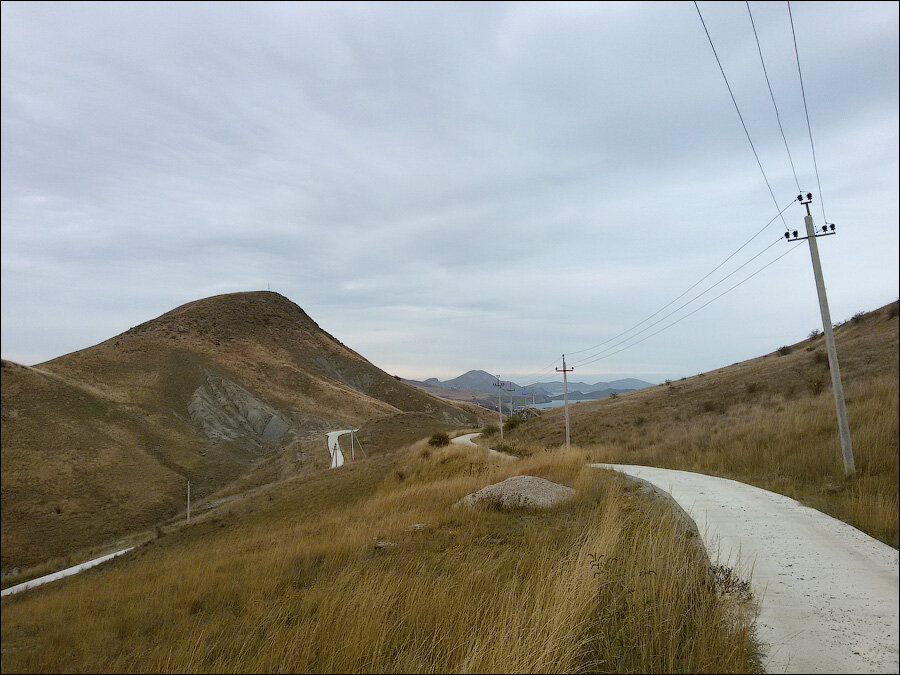 Обратный путь по бетонке был неожиданно красив. Плавные изгибы дороги обрамлялись редким кустарником, и впереди, в просвете распадка, синела полоска моря, и светился проблеск ясности в пасмурных небесах. Знакомой тропкой по склону двугорбой горы с метким прозвищем Верблюд мы спустились с горы в посёлок. И пошли петляющими улочками Коктебеля — к трассе.