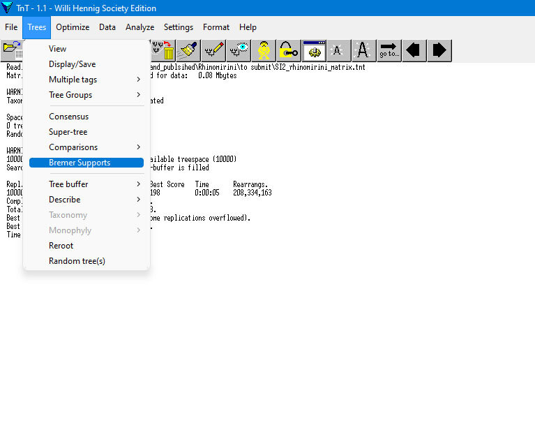 В прошлый раз я написала о том, как посчитать статистические поддержки в TNT. Теперь пришла очередь поддержек Бремера (их суть объяснена здесь). Для того, чтобы их посчитать, надо сначала провести филогенетический анализ любым способом (как это делать, написано по ссылкам Часть 1 и Часть 2). На основе его результатов и деревьев в памяти программы будут подсчитываться поддержки. Когда анализ завершится, надо в главном меню выбрать Trees, и в выпадающем меню Bremer Supports. Появится вот такое окно Тут можно все оставить как есть. Только в Calculate supports надо переставить галку с "existing suboptimal trees" на "TBR from existing trees". Дело в том, что TNT в норме не сохраняет все деревья, потому что это будет требовать много памяти и времени. Поэтому потребуется сделать дополнительно TBR на имеющихся деревьях, чтобы найти больше топологий с определенной длинной. Давайте проведем эксперимент и оставим галку на existing suboptimal trees, то есть использовать деревья, которые уже ес