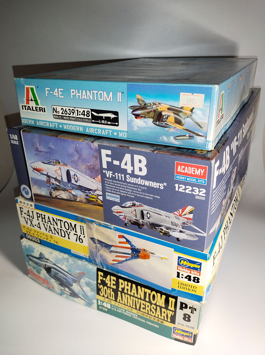 Сегодня будет история появления в моих фондах этой стопочки коробок. Есть такие самолёты-символы, которые почти "обязан" собрать любой моделист 🙂 Например, F-4 "Фантом" или МиГ-21. Стопкой МиГ-21 не отягощён - один Эудардовский МиГ-21 МФ собран, второй, МиГ21 БИС, в стадии активной сборки. А вот Фантомы пока ждут своего часа. Италовский F-4 появился первым. Пройти мимо превосходного своими декалями Картографа на вьетнамский вариант F-4 не смог. Сам набор по детализации не очень. Обычный средний Италери. Но иногда можно приобрести набор ради декалей. Часто именно такие наборы оказываются немногим, а то и в одну цену с афтемаркетовскими декалями. А пластик своеобразный бонус. Вторым появился набор Хасегавы F-4E c декалью посвященной 30 летнему юбилею службы Фантома в ВВС США. Это был подарок. Модели Хасегавы по прежнему выглядят очень достойно на фоне современных наборов. Да им не хватает детализированности в мелочах, но их сила в очень правильной геометрии, когда мастер-модели дела