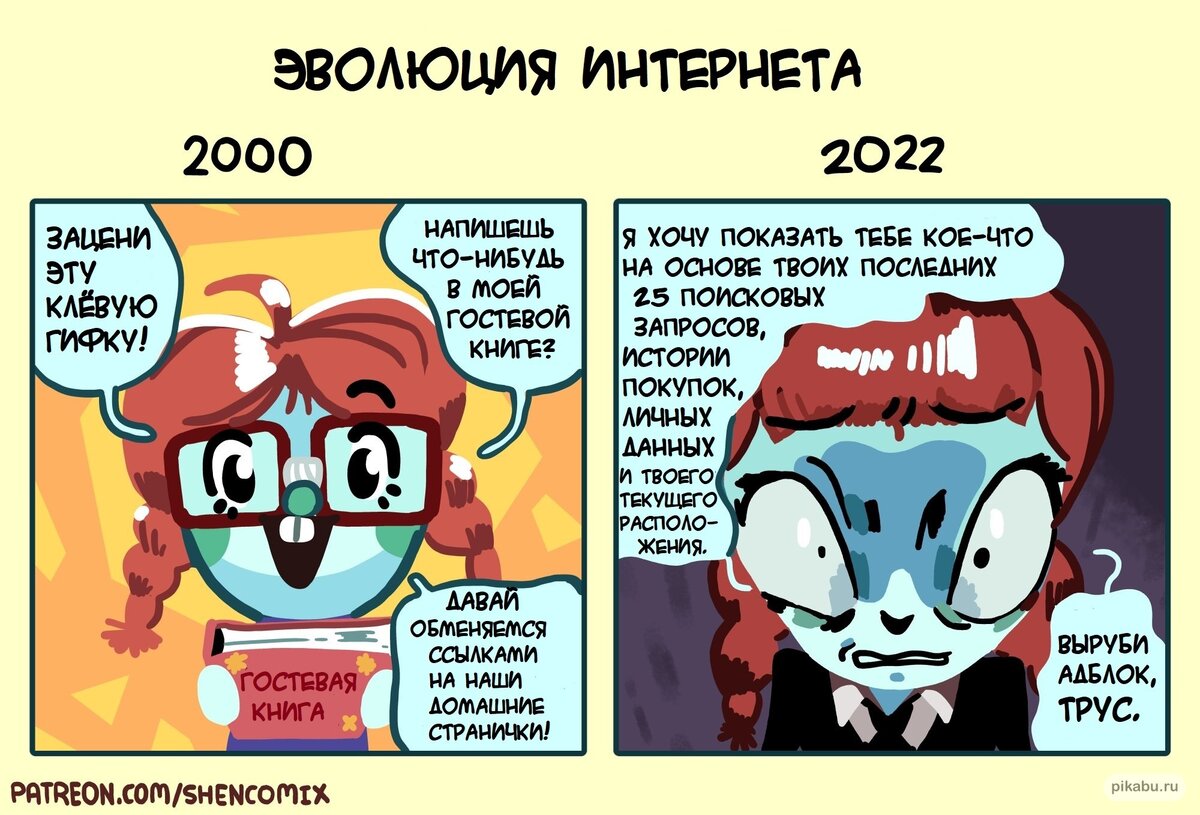 Привет, дорогой друг! Без лишних предисловий скажу, что сегодня тебя ждут 7 забавных комиксов от разных авторов, которые посвящены интернету. С одной стороны, эта технология появилась в нашей жизни относительно недавно (каких-то пару десятилетий), а с другой, она уже конкретно изменила наши модели поведения и продолжает менять их до сих пор. Как и все аспекты нашей жизни, интернет имеет как положительные стороны, упрощающие жизнь, так и особенности, увеличивающие отрицательное воздействие на нее. Самые яркие стереотипы, связанные с нашим поведением в сети, найдут отражение в сегодняшних комиксах. Начнем! Как я уже сказал, с момента появления в нашей жизни интернета прошло всего пару десятилетий, но за это время технология сильно эволюционировала. Художник Эндрю Тсястон, автор веб-комикса Shen comix, считает, что развитие происходит даже слишком быстро. С появлением виртуальной жизни многие стали уделять реальной гораздо меньше внимания. Кто-то может взгрустнуть по этому поводу, я же ск