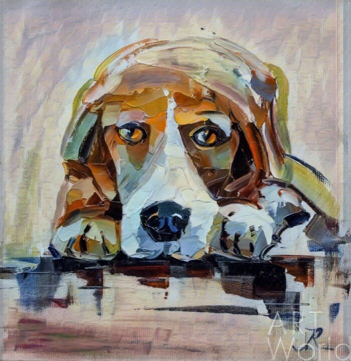 Теперь, что касается картины: её рисовала собака и как сказала она сама, автор изобразила себя такой, какой хотела бы себя видеть. На вопрос о том, счастлива ли она на самом деле, собака не ответила.