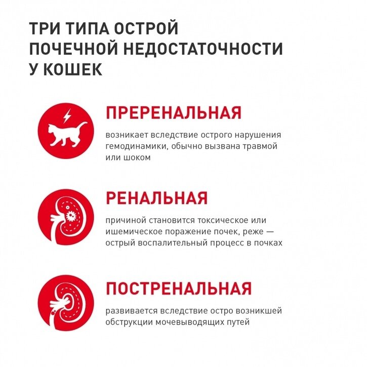 Почечная недостаточность — это нарушение нормальной работы почек, в результате которого они перестают выполнять одну или несколько своих функций. Почечная недостаточность у кошек может быть вызвана десятками разных причин. Она бывает у животных разного возраста и разных пород и делится на два типа — острую и хроническую.