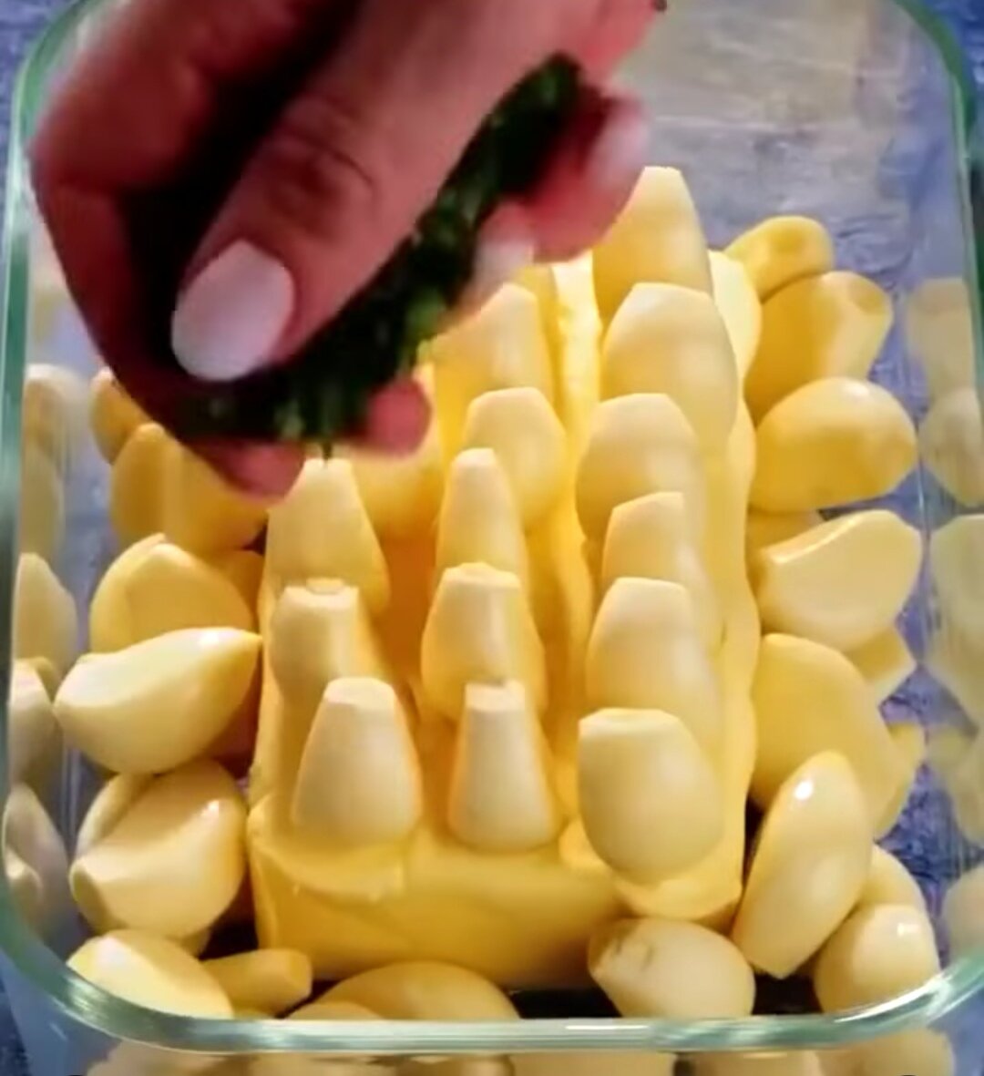 Оригинальный рецепт масла с чесноком. Попробуйте и вы останетесь в восторге. Нам потребуется В жаропрочную форму укладываем масло и в него вставляем зубчики чеснока. Оставшееся место тоже заполняем зубчиками чеснока и сверху посыпанм зеленью. Далее убираем нашу форму в духовку. Как только масло растопить я, поддержите в духовке ещё минут 8. Затем вынимаем и сливаем наше масло в миску. Миску остудить и можно дегустировать. Отлично подойдёт для завтрака на хлеб. Приятных хлопот на кухне.