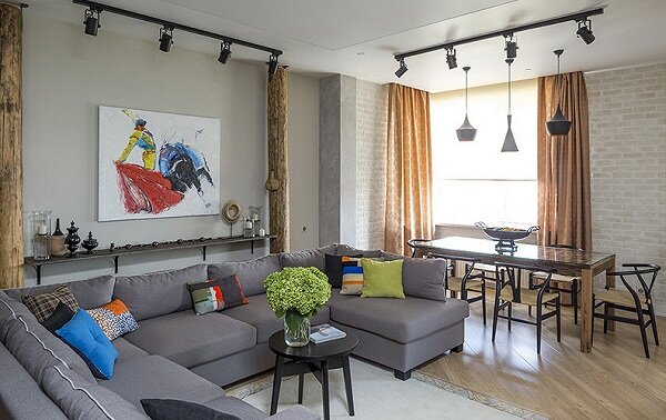 Гибкое решение. Трековая система с двойной подсветкой позволяет сделать освещение не только функциональным, но и декоративным. Точечные светильники обеспечивают практичное освещение, а направленный вниз светильник с абажуром заливает мягким светом центр комнаты.