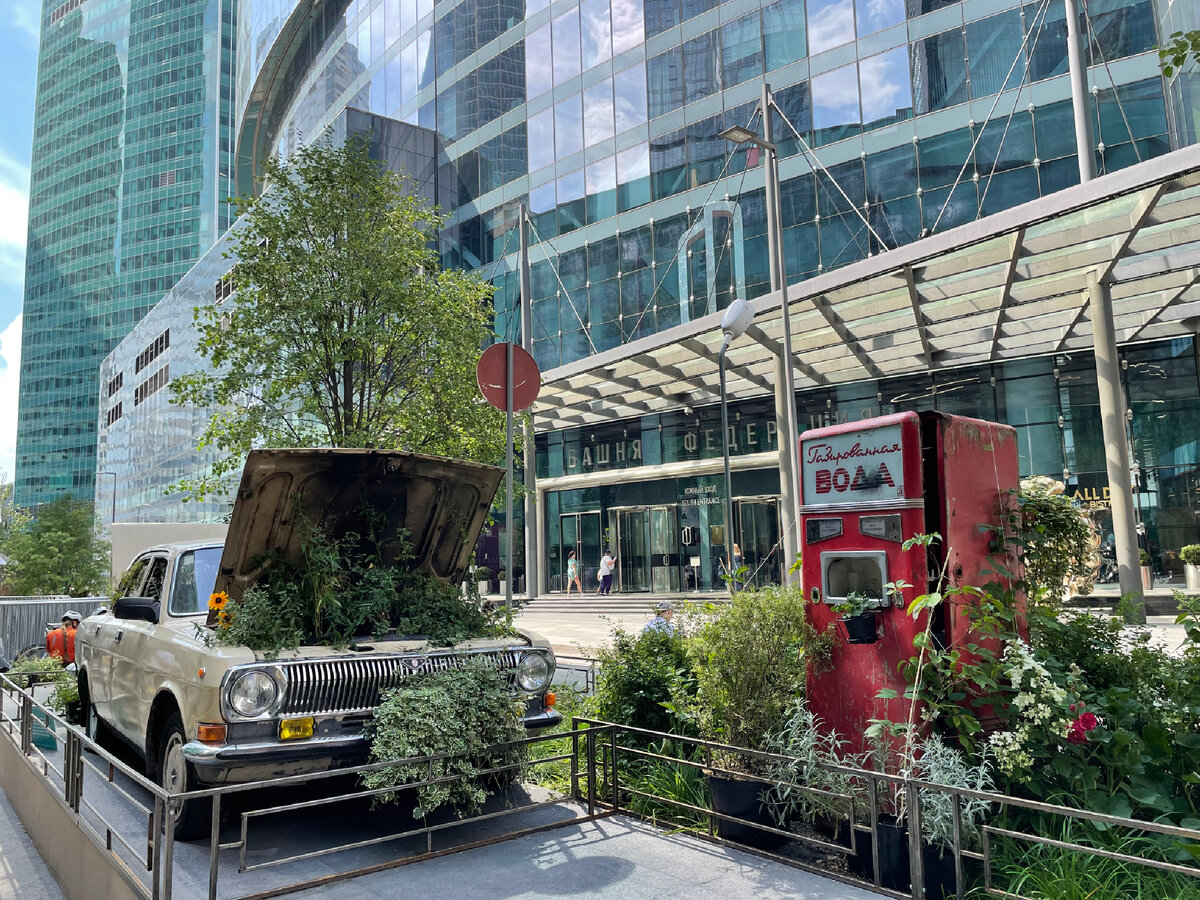 Афимолл устроил выставку советских ретро автомобилей. Здесь из автомобилей сделали горшки для цветов.