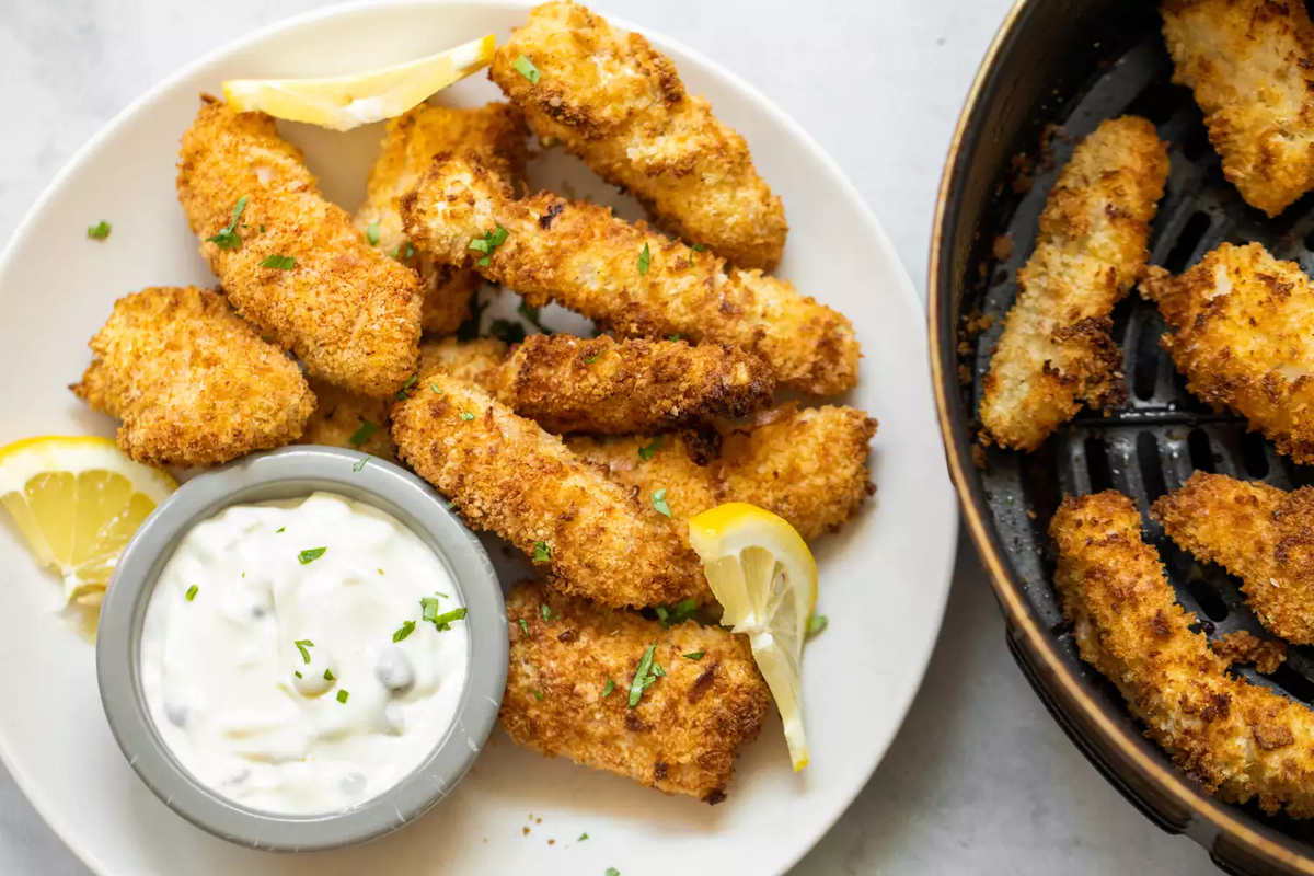 Подготовьте аэрогриль: Распылите на аэрогриль антипригарный спрей. Некоторые люди предпочитают предварительно разогревать фритюрницу, но я думаю, что для этого рецепта это необязательно. Подготовить панировочную станцию: Смешайте кукурузный крахмал, соль и перец в большом неглубоком блюде. В отдельной неглубокой тарелке взбейте яйца. Добавьте панко и паприку в третье неглубокое блюдо. Панируем рыбу: Добавьте рыбные палочки в кукурузный крахмал и хорошо перемешайте. Затем добавьте к яичной смеси, чтобы покрыть, и, наконец, добавьте к панировочным сухарям, убедившись, что они покрыты со всех сторон. Обжарить рыбные палочки в воздухе: Работая партиями, положите рыбные палочки в корзину для фритюрницы ровным слоем. Слегка сбрызните их кулинарным спреем. Обжарьте на воздухе в течение 6 минут при 190˚. Переверните рыбные палочки щипцами и жарьте еще 4-6 минут до золотисто-коричневого цвета. При желании посолить по вкусу. Повторите со второй партией рыбных палочек. Приготовьте соус тартар из
