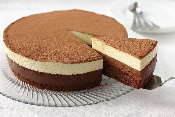 До чего же вкусный, воздушный и нежный этот торт! Вам потребуется: ❤🔥Мука - 60 грамм ❤🔥Какао - 20 грамм ❤🔥Сахар - 60 грамм ❤🔥Масло сливочное - 50 грамм ❤🔥Яйца - 3 штуки ❤🔥Ванильный сахар - 1-2 чайные ложки Мусс из темного шоколада: 🔸️Шоколад - 150 грамм 🔸️Сливки, жирностью не менее 30% - 300 миллилитров 🔸️Желатин - 2 грамма 🔸️Яйцо - 1 штука 🔸️Желток - 1 штука 🔸️Сахар - 30 грамм Мусс из белого шоколада: 🔸️Шоколад белый - 150 грамм 🔸️Сливки, жирностью не менее 30% - 300 миллилитров 🔸️Яйцо - 1 штука 🔸️Сахар - 30 грамм Приготовление: 🟤Прежде всего форму для выпечки диаметром 26 сантиметров выстилаем бумагой для выпечки и смазываем маслом. В миску миксера разбиваем 3 яйца, добавляем 60 граммов сахара, одну чайную ложку ванильного сахара и взбиваем на высокой скорости до получения белой пышной массы. Объем, при этом, должен увеличиться в 3 раза. 🟤Пока яично-сахарная смесь взбивается, подготовим муку с какао. В миску просеиваем 60 граммов муки и 20 граммов какао,