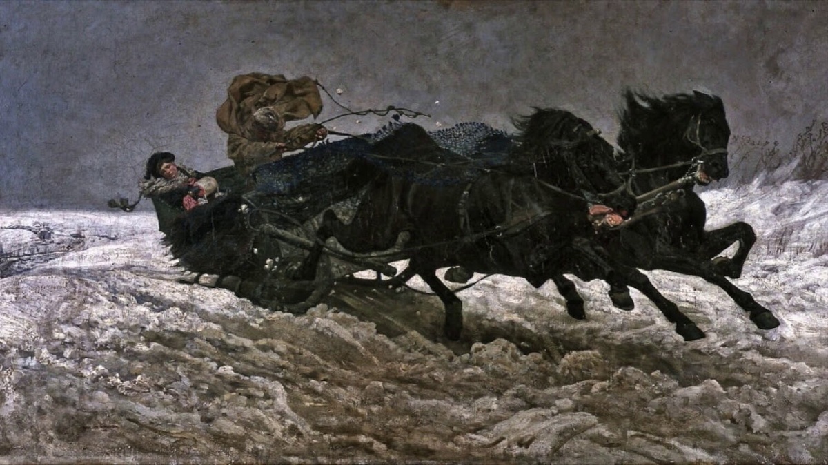 Шёл мужик в деревню одну расчёт получать всю работу сделал, вот и за деньгами пошёл, пошёл значиться в эту деревню а дорога туда только одна вела шёл он осенью когда рано темнело идёт он по этой дороге, а сам всю думу думает как же он потом с этой дороги будет выходить а с деньгами то по лесу страшно идти и тут слышит звон колокольчиков тройка едет за ним барская такая пустая едет тройка, говорит только мужик правит, мужик то наш отошёл подальше за дерево спрятался, а тройка то пронеслась пролетела, а тот опять думу думает говорит как же я с деньгами то возвращаться буду мало ли на кого нарвусь а деньги то не малые, надобно к зиме все купить вот и идёт шёл шёл думу свою думал как вдруг видит тройка обратно несется, только уже не пустая сидит значиться в этой тройке девица бледная волосы растрепаны да на ней одна рубаха сидит значиться а глаза у неё страшнючие, смотрит она перед собой словно ничего не видит, а мужик который тройку вел всё весело говорит посвистывает, девка-то сидит слов