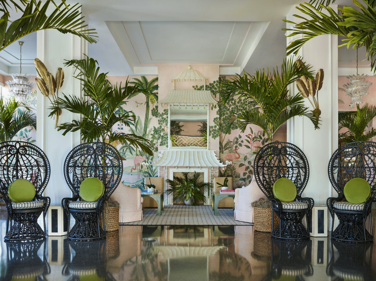 Друзья! Спешу к Вам с новой интересной рубрикой, в которой мы вместе посетим незабываемые интерьеры из разных уголков мира, ведь очень важно не упускать случая испытать нечто новое, это расширяет кругозор. Хочу рассказать вам о лобби легендарного отеля Colony, который недавно обновил имидж благодаря усилиям хозяйки гостиницы Сары Ветенхолл и фирмы Kemble Interiors. Они взяли за основу оригинальную фреску середины XX века, украшавшую лобби отеля, когда он впервые распахнул свои двери в 1947 году. Розовые лакированные кресла, латунные пальмовые столы, огромные тропические растения и высокий камин ручной работы в стиле шинуазри объединили расписанными вручную обоями degournay. Мастера фирмы создали уникальный узор на тему Палм-Бич с изображением местной флоры и фауны. Обои изображают богатую природу Флориды на специальной розовой бумаге Edo Xuan Paper. Среди зубастых аллигаторов, изящных фламинго и вальяжных пантер есть личные темы, такие как обезьянка-талисман Colony и милый хозяйский пе