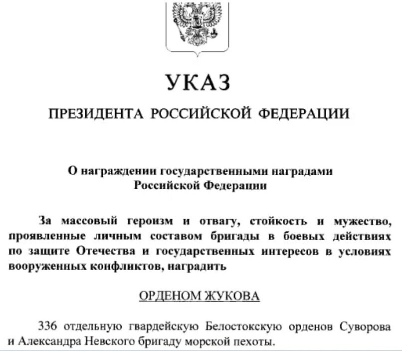 Президент Российской Федерации Владимир Путин наградил (http://publication.pravo.gov.ru/Document/View/0001202211040029) орденом Жукова 336-ю отдельную гвардейскую Белостокскую орденов Суворова и Александра Невского бригаду морской пехоты.