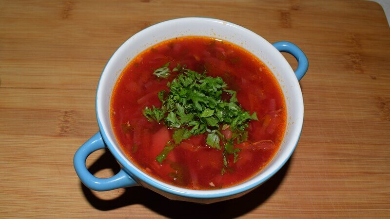 Вариантов приготовления борща столько же, сколько звезд на небе. Представляю Вам один из самых вкуснейших вариантов приготовления украинского борща без добавления в заправку сала. Попробуйте, и Вы точно не пожалеете. Порции: –+10 Ингредиенты: Для начала начинаем варить мясной бульон. В большую кастрюлю или казан помещаем мясо целым куском. Заливаем холодной водой (у меня 3 литра). Ставим на огонь. В процессе закипания снимаем пену. После того как вода закипит убавляем огонь так, чтобы бульон слегка булькал. Закрываем неплотно крышкой и оставляем вариться на 1,5 часа. За 40 минут добавляем в бульон луковичку, морковку и стебель сельдерея. Режем овощи. Лук — четверть кольцами. Морковь натираем на крупной терке. Помидоры бланшируем (ошпариваем кипятком и снимаем кожицу). Нарезаем кубиками или ломтиками. Перец болгарский тонкими брусочками. Зелень и чеснок нарезаем очень мелко и соединяем в одной посуде. Капусту шинкуем. Картофель, стандартно, как на любой другой суп. Свеклу натираем на кр