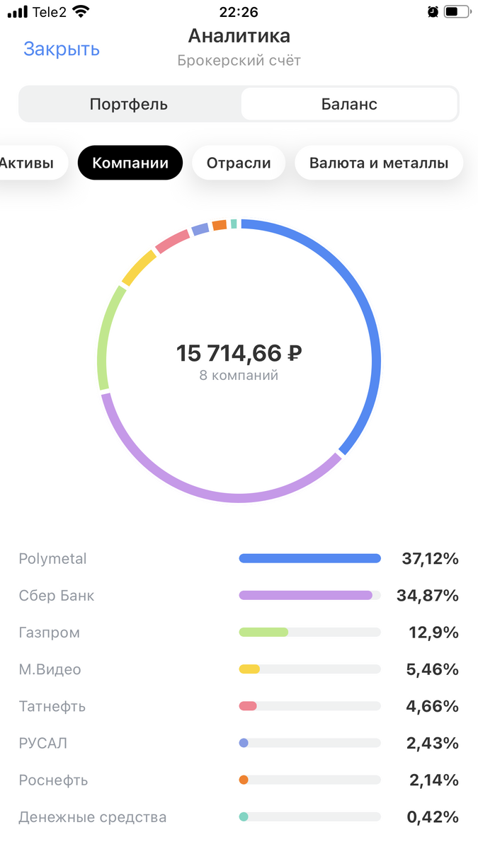 Признаюсь честно, что я очень мало понимаю в инвестировании, но у меня есть четкое понимание, что мне это необходимо и интересно. Сейчас мой портфель выглядит так.