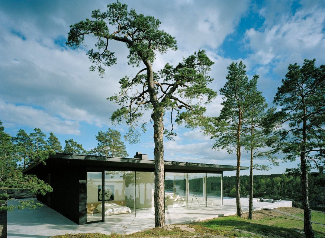Бетонный фундамент, черная штукатурка и матовый белый - ключевые особенности проекта. Одноэтажная Вилла Оверби площадью 250 м? расположена на вершине скалистого мыса в Вермде, Стокгольм и была спроектирована архитектурным бюро John Robert Nilsson Architecture. Бетонный фундамент выполнен в виде массивного постамента, из которого проложены дорожки вдоль трех фасадов дома под высокими навесами крыши. Внешний вид дома темный, с черной штукатуркой, стальными деталями и большими застекленными площадями. Одна из стен дома оштукатурена и обесцвечена до матово-черного цвета, а внутренние стены и потолок окрашены в матовый белый. Входная дверь выполнена из черного мореного дуба. Остальные фасады являются полностью стеклянными. В проекте использовано теплоизоляционное стекло, которое состоит из внешнего совершенно прозрачного слоя стекла Optiwhite и внутреннего слоя терморегулирующего стекла. Понравился проект? Дом - это всегда портрет владельца. Если вы хотите, чтобы ваш дом стал идеальным отр