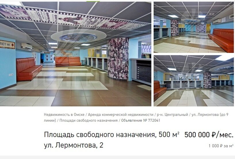 Ещё один кинотеатр в Омске решил «потесниться». На одном из сайтов объявлений появилось предложение об аренде помещения в 500 «квадратов» на улице Лермонтова, 2. По этому адресу располагается киноцентр «Вавилон». Судя по фото, сдать предлагают цокольный этаж здания, где находились гардероб и один из малых кинозалов. Помещение украшено знаменитой «вавилонской» фреской и коллажами об истории кино. В аренду его предлагают сдать за 500 тысяч рублей (1000 рублей за кввадратный метр). По словам авторов объявления, в помещении можно открыть клуб или ресторан, также есть вариант расширения и аренды дополнительных площадей. «Любимое место всех Омичей и гостей города, набережная, соединение двух рек Иртыш и Омь. Мы предлагаем в долгосрочную аренду все помещение, можно частями (готовы рассмотреть вариант продажи). Можно использовать, как готовый бизнес — кинотеатр, смело организовать закрытый клуб, ресторан, ночное развлекательное заведение», — говорится в объявлении. Напомним, ранее такую же та