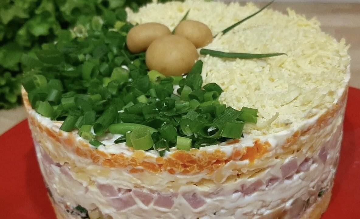 Приветствую на своей странице! Такой салат из ветчины и куры можно приготовить к любому праздничному столу. Он очень прост в приготовлении, очень вкусный и питательный. Для фуршета это блюдо подается в креманках. Хочу поделиться с вами рецептом интересного салата, который удивит ваших гостей, да и вас тоже. Этот салат я впервые попробовала у моей бабушки, тогда она работала в столовой и в меню было это блюдо. Но, думаю, тогда вместо курицы копченой, все-таки добавляли говядину. Понравится рецепт? Подписывайтесь на мою страницу, ставьте лайки и комментируйте. Дальше будет еще вкуснее и интереснее! Что потребуется для приготовления: (Граммы и количество ингредиентов не указываю, так как каждая хозяйка готовит разные порции) Приготовление: Куру и ветчину нарезать соломкой. Морковь отварить до готовности и натереть на крупной терке. Яйца отварить вкрутую, остудить и натереть на крупной терке. Шампиньоны лучше брать нарезанные, если все-таки оказалась дома банка целых, порезать соломко