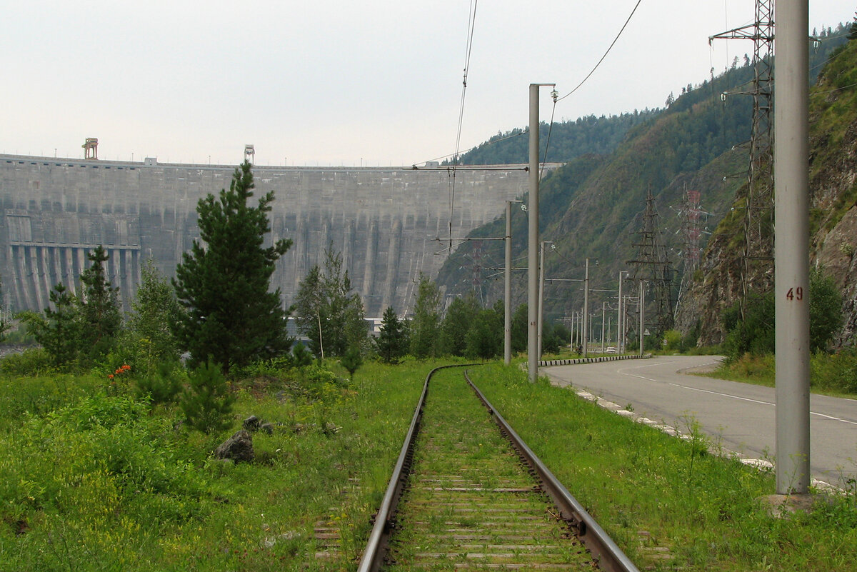 Черёмушкинский трамвай, на заднем плане флагман российской гидроэнергетики - Саяно-Шушенская ГЭС: