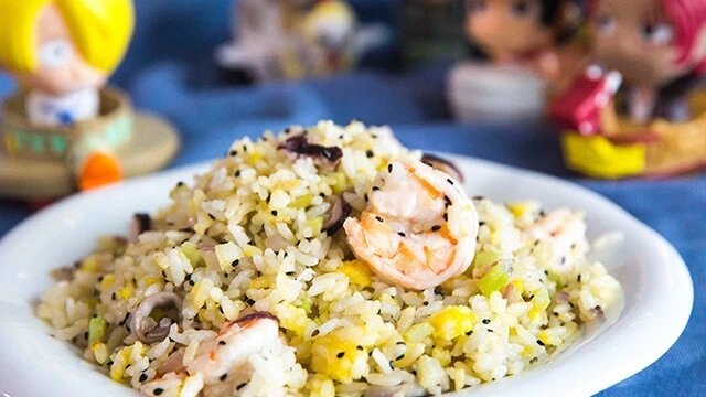 Блюдо из аниме One Piece. В 21 серии первого сезона кок Санджи проявил доброту к умирающему от голода и без гроша в кармане Гину и дал ему бесплатно еду, это рисовое блюдо с креветками, кальмарами и яйцом.
