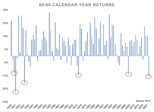 Портфель 60/40 из акций и облигаций США завершал год двузначным снижением лишь пять раз за последние 94 года вплоть до конца 2021 года. Поскольку как акции, так и облигации в 2022 году упали примерно на 15%, похоже, что этот год станет шестым случаем за 95 лет: Доходности портфеля 60/40 по итогам календарных лет. Если мы закончим год так, как обстоят дела на сегодняшний день, то это будет третий по размеру убытков год для портфеля 60/40 почти за 100 лет.