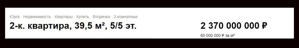 В Юрге выставили на продажу двухкомнатную квартиру на улице Максименко. Особенность этого рядового, казалось бы, объявления в цене — квартиру площадью 39,5 кв.м продают на 2,37 млрд рублей. Как утверждает автор объявления, появившегося на популярной интернет-площадке, квартира находится на пятом этаже пятиэтажки, жилая площадь — 21 кв. м., площадь кухни — 6 кв. м. Иными словами, речь идёт об обычной двухкомнатной «хрущёвке». — При желании можете из этой чудесной, уютной квартиры воплотить в реальность любые ваши дизайнерские мечты, — говорится в объявлении. Высока вероятность того, что в объявление о продаже закралась ошибка. Похожий случай произошёл в прошлом году и в Кемерове — там двухкомнатную квартиру в пятиэтажке продавали за 3 млрд рублей. Впоследствии объявление было отредактировано, из суммы удалили три лишних ноля. Фото: архив A42.RU