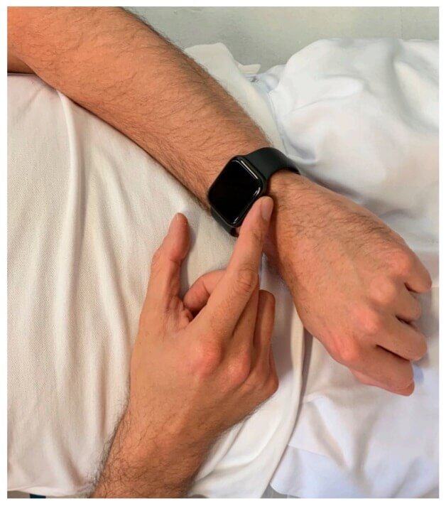 На самом деле никто не запрещает нам изменить положение электродов и сделать электрокардиограмму, например, в трех стандартных отведениях (I, II и III на классической электрокардиограмме по Эйнтховену). Вначале размещаем часы на левой руке и касаемся указательным пальцем кнопки-электрода: Получаем первое отведение! Теперь прижимаем часы (положительный электрод находится на задней крышке часов) к левой нижней части живота и касаемся второго электрода пальцем правой руки. При этом следите, чтобы правая рука не касалась живота: Вот у нас уже кардиограмма во втором отведении! Теперь вместо указательного пальца правой руки, прикладываем палец левой руки. Получается, мы наложили электроды на «левую ногу» и левую руку: А это уже кардиограмма в третьем классическом отведении. И если сравнить полученные кардиограммы, все они будут отличаться в точности, как отличаются аналогичные блоки на медицинской кардиограмме. Вот небольшой пример моих кардиограмм (слева — полученная в больнице, справа — сд