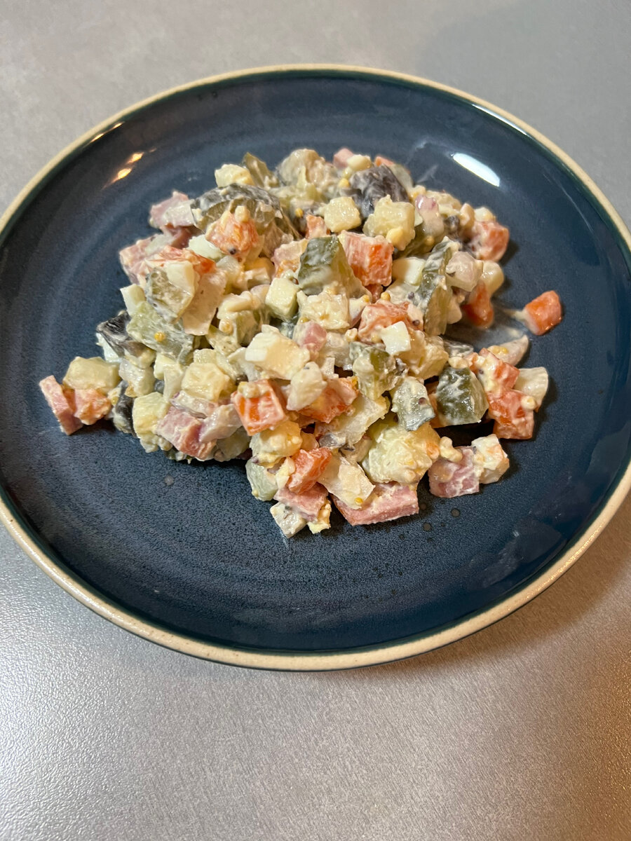 Салат охотничий с солеными огурцами и копчёной колбасой - это просто объедение! Отличная закуска быстро, вкусно и доступно! Прекрасно украсит праздничный стол! Салат можно сделать слоями, или сразу в салатнике! Ингредиенты: Приготовление: Отварной картофель нарезать небольшим кубиком. Отварную морковь нарезать кубиком. Отварные яйца нарезать кубиком. Копченую колбасу нарезать кубиком. Вместо копченой колбасы можно использовать охотничьи колбаски. Соленые огурцы нарезать кубиком. Отварные шампиньоны нарезать кубиком. Чтобы отварить грибы необходимо их очистить, залить горячей водой и варить 10-15 минут. Также можно использовать маринованные грибы. Красный лук нарезать кубиком. Готовим заправку. Необходимо смешать сметану, горчицу, соль, перец и прованские травы. Все перемешать. По желанию вместо сметаны можно использовать майонез. Добавляем заправку в салат. Все хорошо перемешать. Можно подавать к столу. Если решите делать салат слоями, то заправку необходимо сделать заранее и промазыва