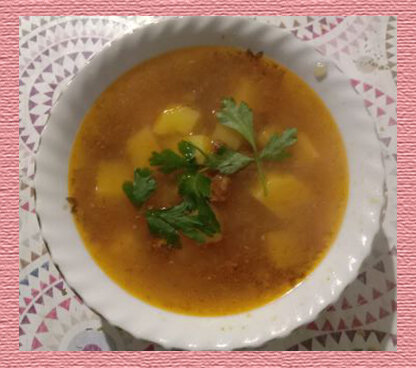 Предлагаю вашему вниманию рецепт супа, который вариться очень быстро (буквально полчаса). Он получается наваристым, красивым и очень вкусным. Фарш может быть любым – говядина, курятина, свинина, индюшатина или смешанным. В оригинальном рецепте используется бараний фарш, но это не важно, т. к. суп всё равно получится. В кастрюлю, в которой буду варить суп, отправляю чеснок, лавровый лист, суповую приправу, перец горошком, 1 морковь, нарезанную крупно, 1 неочищенную, но мытую луковицу (у меня не оказалось) Заливаю 1,5–2 литрами воды – зависит от желаемой густоты супа. Ставлю на огонь и варю 20 минут после закипания. Пока вариться бульон, на сковороде с растительным маслом делаем зажарку из 1 луковицы и 1 моркови. Я готовлю зажарку заранее (здесь рецепт зажарки впрок). В зажарку отправляю фарш и жарю пока фарш не поменяет цвет с розового на серый. Добавляю в зажарку с фаршем томатную пасту. Я ещё добавила укроп, перетёртый с чесноком и маслом. Хорошо перемешиваю, накрываю крышкой и даю