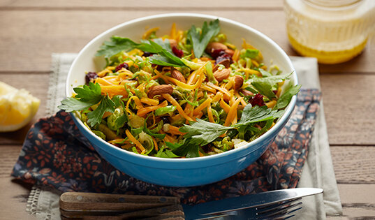 Соль по вкусу (заказать все продукты для приготовления) Как приготовить: 1. Подготовьте все ингредиенты. 2. Отрежьте у каждого кочана конец стебля, разрежьте кочан пополам и тонко нашинкуйте. 3. Смешайте масло, лимонный сок, горчицу, мед, соль и перец. 4. Полейте заправкой капусту и как следует перемешайте, слегка массируя листья. Оставьте на 15 минут, затем добавьте к капусте клюкву, тёртый сыр, рубленый миндаль и нарезанную петрушку. 5. Такой салат можно приготовить заранее или подавать сразу же после приготовления. Пр