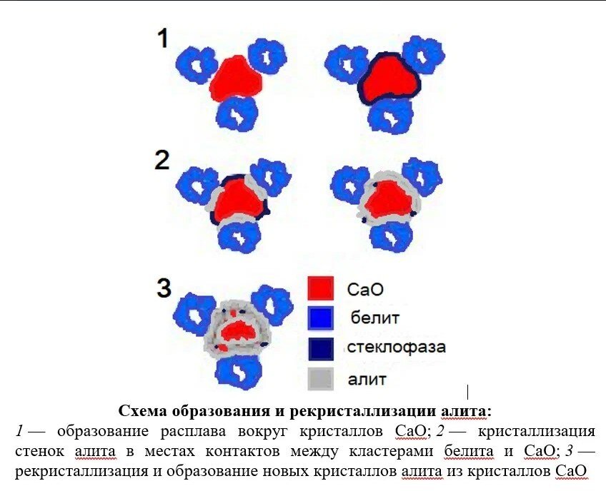 Это, в свою очередь, обусловливает дальнейший ход процесса образования в расплаве и выделения из него C3S до почти полного связывания СаОсво. с C2S. Как уже отмечалось ранее, трёхкальциевый силикат выделяется из расплава вместе с небольшими количествами А1203, и MgO, образуя с ними твёрдый раствор, который называют алитом. Формулу алита иногда записывают как 54СаО·16SiO2·Al2O3·MgO (формула Джеффри).