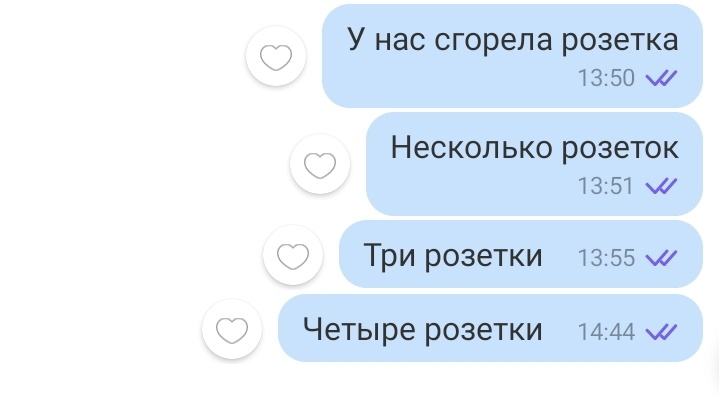 Вот такие сообщения получил от меня муж. Потом он сказал, что надеялся на то, что я сожгла тройник :))) Пять розеток в итоге, пять розеток вышло из строя!!! В ночи неожиданно стал пиликать домашний телефон. Сначала краткими звуками, потом более настойчиво. Но не как звонок, а как звук присоединения трубки к базе. Мы ничего не поняли, решили, что какие-то перебои в сети, отключили телефон, а утром благополучно про него забыли. Потом я уже была дома одна и услышала из розетки хлопок. В ней как раз заряжался мобильный. Я подумала, что телефону кердык, но он работал. Я пошла искать новую розетку для зарядки и нашла её не с первого раза. По мере поиска писала мужу сообщения. После последнего муж перезвонил, объяснил, как выключить автомат и велел ничего не трогать. Уже вечером слабое звено было найдено. Мы нашли забытую старую розетку. Все розетки в квартире были со временем заменены, а про эту, за дверью в уголке, все забыли. В неё включен холодильник и подведена ещё розетка. Как в старой