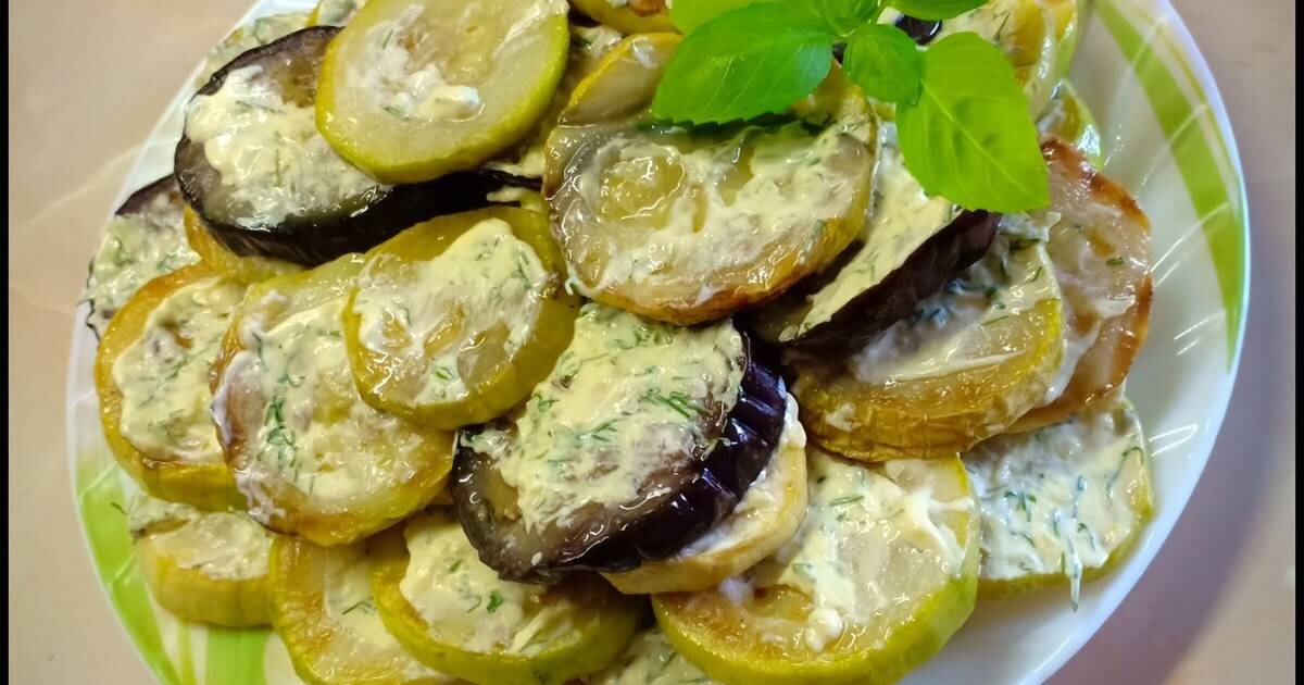 Ингредиенты: Приготовление Хорошенько вымойте овощи и срежьте с них корешки. Сперва нарежьте кружками баклажан. Каждый кружок должен быть толщиной в 1 сантиметр. Посыпьте нарезанный баклажан солью и оставьте на 15 минут. Теперь займитесь кабачком. Точно так же, как и в первом пункте, нарежьте кабачок кружочками, но солить его не надо. Сразу же поджарьте кружки кабачка в небольшом количестве масла и сложите в тарелку. Теперь поджарьте солёный баклажан, но его выложите на салфетку, потому что он сильно впитывает в себя масло. Очистите чеснок от шелухи и натрите на мелкой тёрке. Можете воспользоваться прессом, если отверстия в нём не сильно крупные. Сполосните зелень в холодной воде, мелко нашинкуйте и смешайте с чесноком. Теперь возьмите чистое блюдо и начинайте выкладывать овощи слоями: сначала выложите кабачки, посыпьте их солью (при жарке ведь их не солили), смажьте чесночной зеленью и сдобрите немного уксусом; в таком же порядке выложите баклажаны (только не солите!). Когда блюдо с з