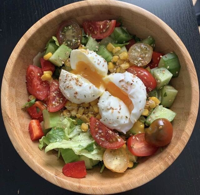 // Завтрак: Одно-два яйца всмятку, салат из свежих овощей (помидоры, огурцы, пекинская капуста, пророщенные семена, травы) с 1 ч. л. оливкового масла, зеленый чай или кофе без сахара и молока.