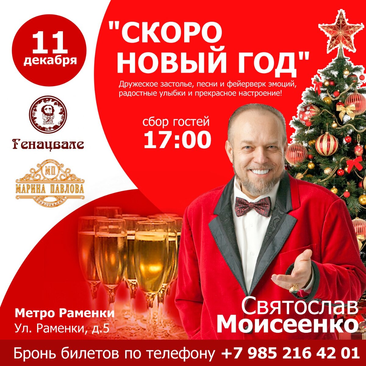 Дорогие мои друзья! Самая лучшая в мире публика! Мы долго не встречались на наших уютных вечеринках и мне часто задавали вопрос: ну когда же? Мы решились! И 11 декабря, в воскресенье, ждём всех вас, по ком так соскучились, в прекрасном новом ресторане «Генацвале» на ул. Раменки, д. 5 (рядом с м. «Раменки»). Фейерверк эмоций, прекрасное настроение, искренние улыбки и предновогоднее настроение гарантированы! Ведь наш вечер так и называется «СКОРО НОВЫЙ ГОД»! С вами рады будут увидеться · Великолепная музыкальная актриса и кинодива Ксения Кастор · Легенда советского кино Юрий Торсуев (ну кто ж не помнит Сыроежкина из «Приключений Электроника»?) · Народный артист РСФСР Всеволод Шиловский (о творчестве этого великого мэтра можно говорить часами) · Заслуженная артистка России Людмила Бодрова, прима и несомненное украшение театра им. Н. Сац · Талантливейший, никогда не унывающий, позитивный и яркий Прохор Шаляпин · Легендарная Земфира Жемчужная, эталон цыганского творчества на российской эстр