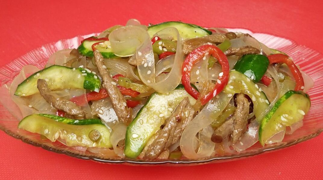 Лапша производится из крахмала бобов мунг. Или проще говоря из маша. Приобрести такую лапшу можно в азиатских магазинах, на рынках, где торгуют китайскими продовольственными товарами или заказать в Интернете. Предлагаем Вашему вниманию наш семейный, домашний рецепт салата из широкой крахмальной лапши. Рецепт Лапша крахмальная широкая - 170-200 гр. (1 пачка) Филе говядины - 250-300 гр. Огурцы - 2-3 шт. Перец сладкий - 100-150 гр. Перец острый или полуострый - 100 гр. Лук репчатый - 150 гр. Чесночные стрелки - 50-100 гр. Чеснок - 2-3 зубчика Масло растительное - 100 мл. Соевый соус - 2 ст.л. Масло кунжутное - 1 ст.л. Соль - щепотка по вкусу Черный перец - по вкусу СПОСОБ ПРИГОТОВЛЕНИЯ Итак, приступаем... Подготовим овощи и мясо. Чесночные стрелки нарезаем тоненькими кружочками. Сладкий и острый перец режем соломкой. Репчатый лук нарезаем полукольцами, чеснок пропускаем через чеснокодавилку. Огурцы режем сначала вдоль пополам, а затем каждую половинку на тонкие пластинки вдоль огурца. На